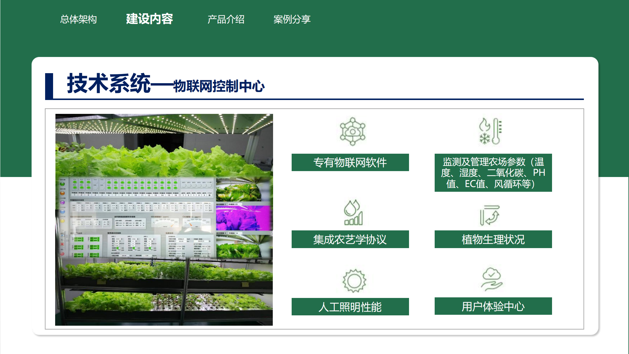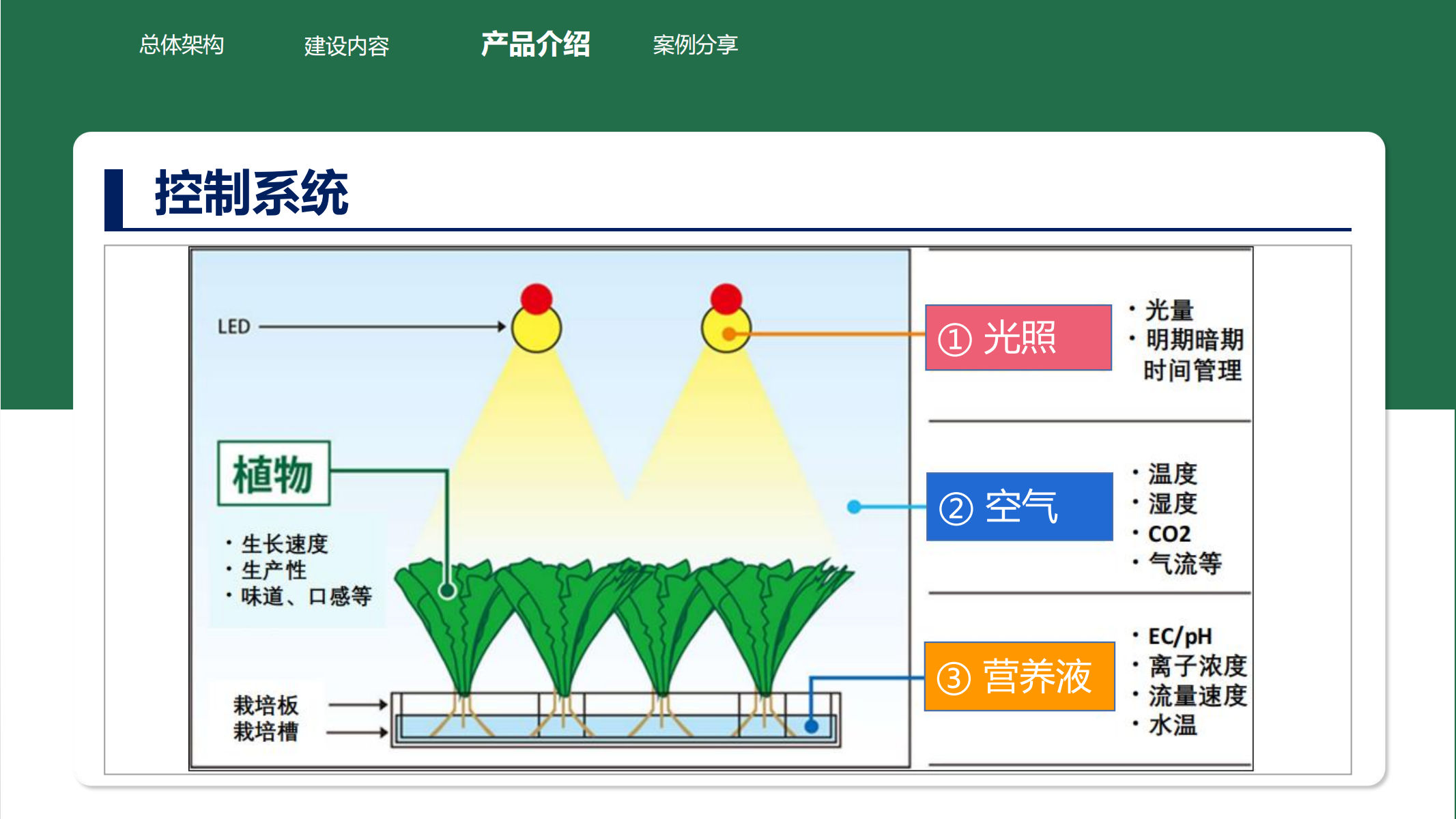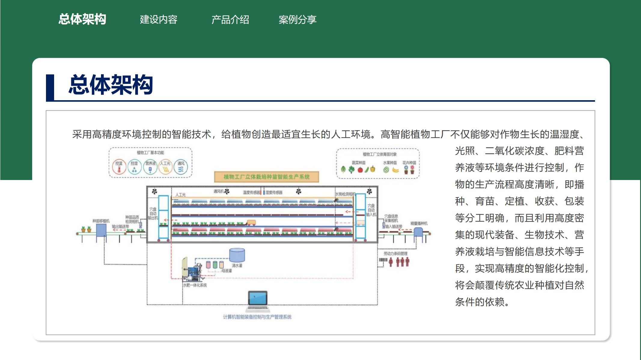 采用高精度农环服境托控管制的智能技术,给植物创造最适宜生长的人工环境。高智能植物工厂不仅能够对作物生长的温湿度、光照、二氧化碳浓度、肥料营养液等环境条件进行控制,作物的生产流程高度清晰,即播种、育苗、定植、收获、包装等分工明确,而且利用高度密集的现代装备、生物技术、营养液栽培与智能信息技术等手段,实现高精度的智能化控制,将会颠覆传统农业种植对自然条件的依赖。
